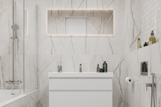 Светлый и просторный санузел воплощает идею современного комфорта с элементами элегантной роскоши. Эстетика мрамора Silver Root задаёт тон всему пространству — она привносит в интерьер благородные оттенки и утончённую текстуру, создавая ощущение премиальности без излишеств.