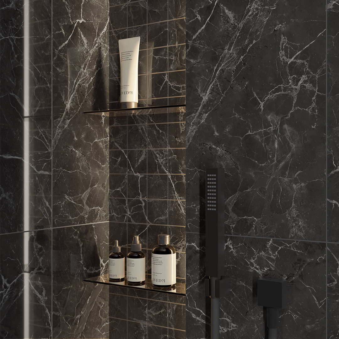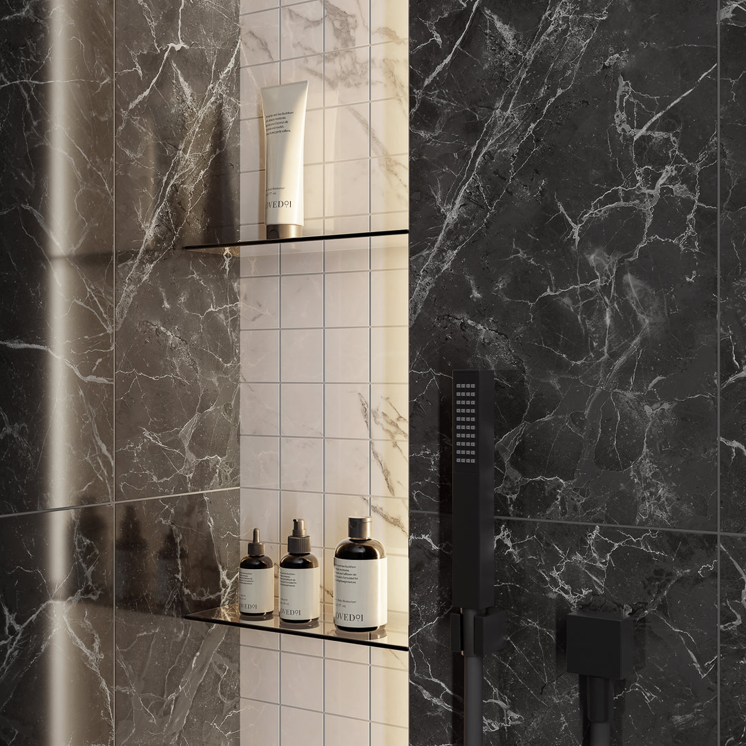 Контраст чёрного и белого мрамора – беспроигрышный вариант для создания обстановки. Ещё одно оригинальное декоративное решение, впервые предложенное в этой серии, – своеобразный «дуэт» плитки с отверстием и совпадающих с ним круглых элементов для включения в композицию собственных наборных декоров.