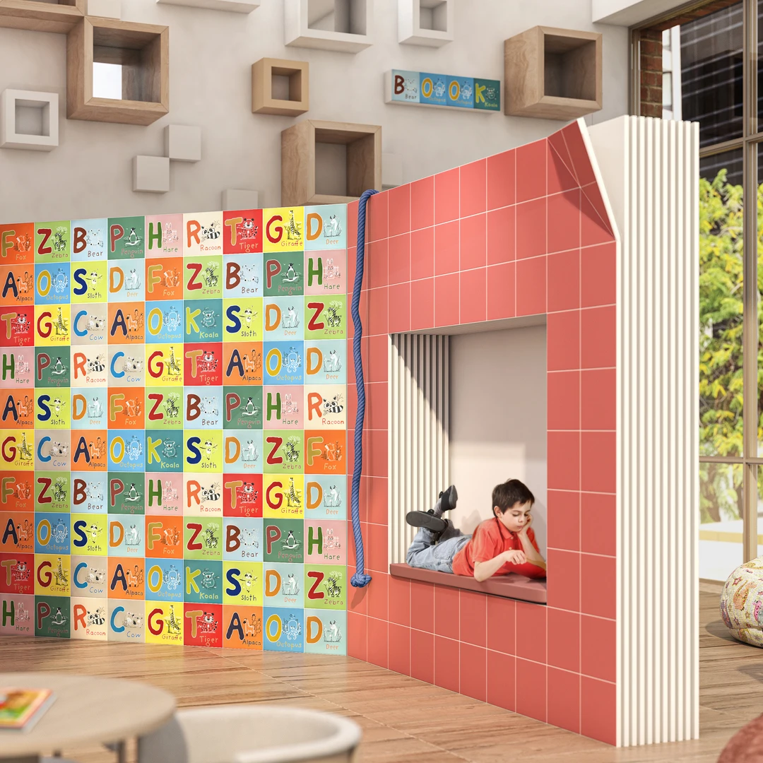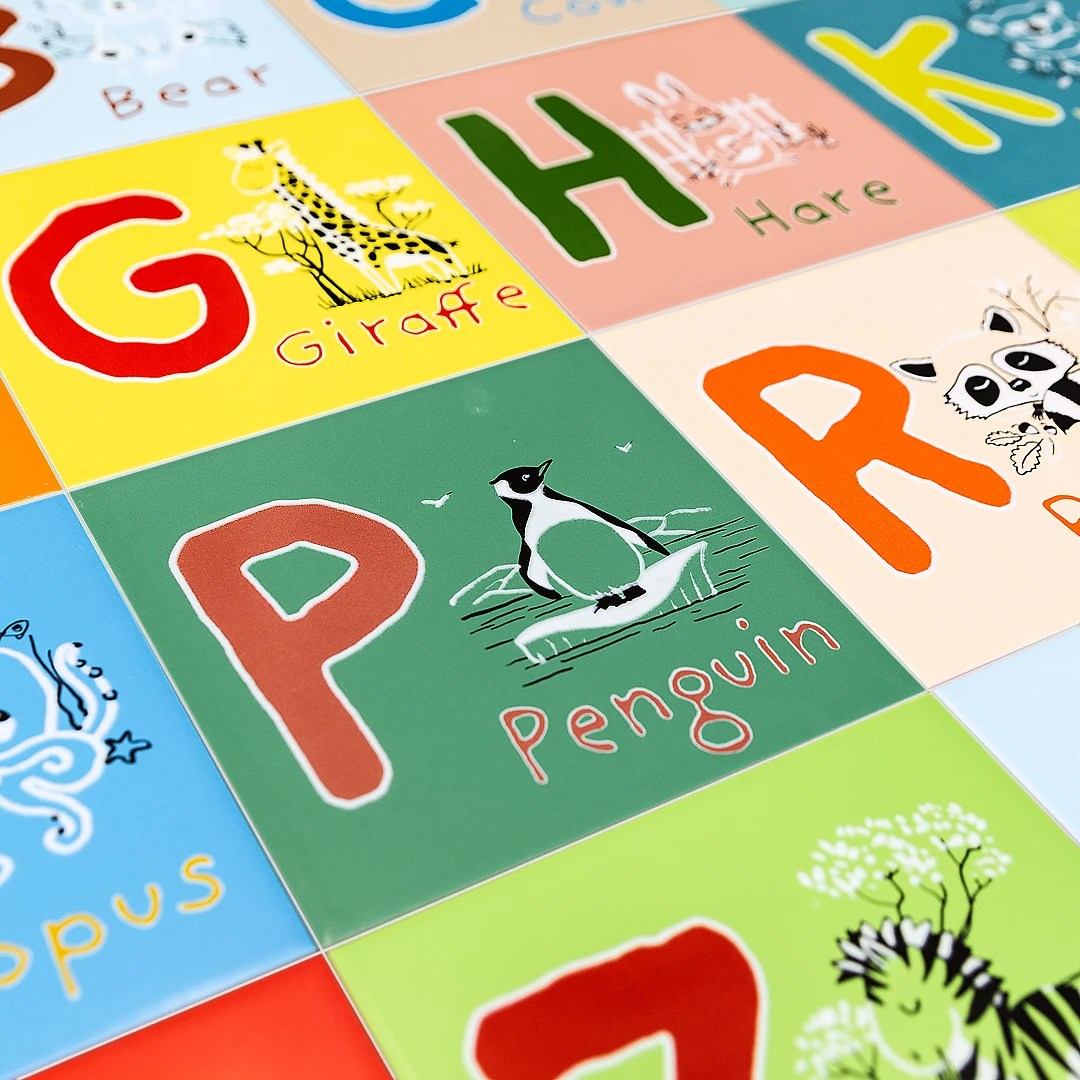 Учим английский алфавит и новые слова! На каждой плитке, помимо латинской буквы и начинающегося с неё слова, размещена картинка животного. Контуры рисунка выполнены белым декоративным составом, который придаёт изображению объём, помогает сделать декор более выразительным.